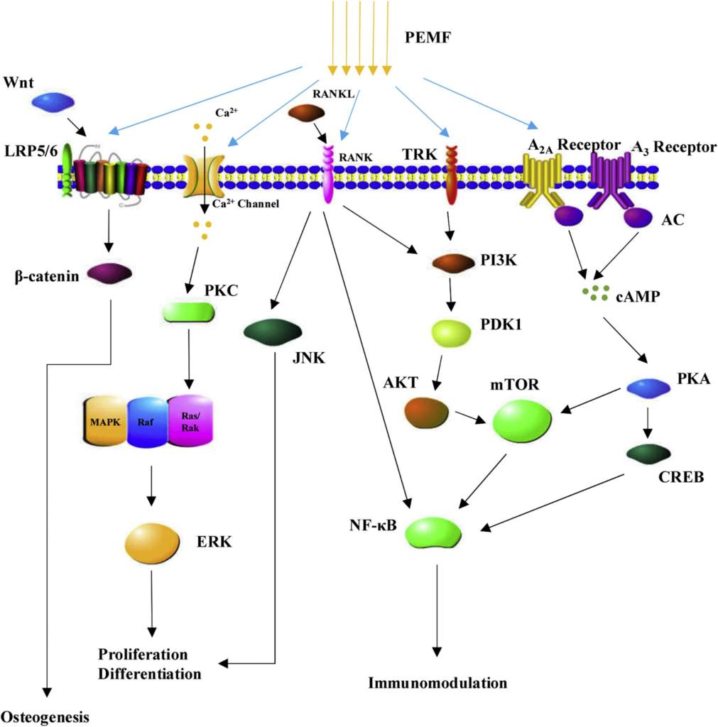 A recent review summarized the underlying signaling pathways of PEMFs, including Ca2+, Wnt/β-catenin, mitogen-activated protein kinase (MAPK), fibroblast growth factor (FGF), and vascular endothelial growth factor (VEGF), transforming growth factor (TGF)-β/ bone morphogenetic proteins (BMP), insulin-like growth factor (IGF), Notch, and cAMP/protein kinase A (PKA), in bone repair [49]. Furthermore, the mammalian target of rapamycin (mTOR) pathway has also been demonstrated to be the underlying signaling pathway of PEMFs involved in bone formation [50]. Of note, PEMF exposure also affected the synthesis of growth factors such as IGF [51], BMP [52], TGF-β [53], and PGE2 [54], promoting the synthesis of extra-cellular matrix (ECM) proteins and facilitating tissue repair [6].